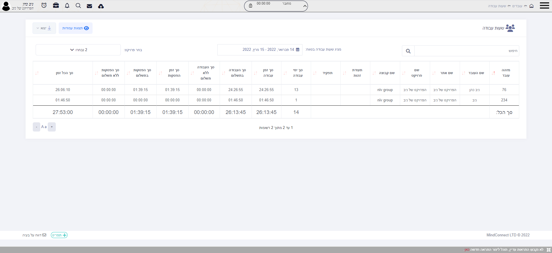 | 11:34, 15 במרץ 2022 | פירוט כל שעות העבודה.png (קובץ) | 121 קילו־בייטים | ניב | 1 | ||